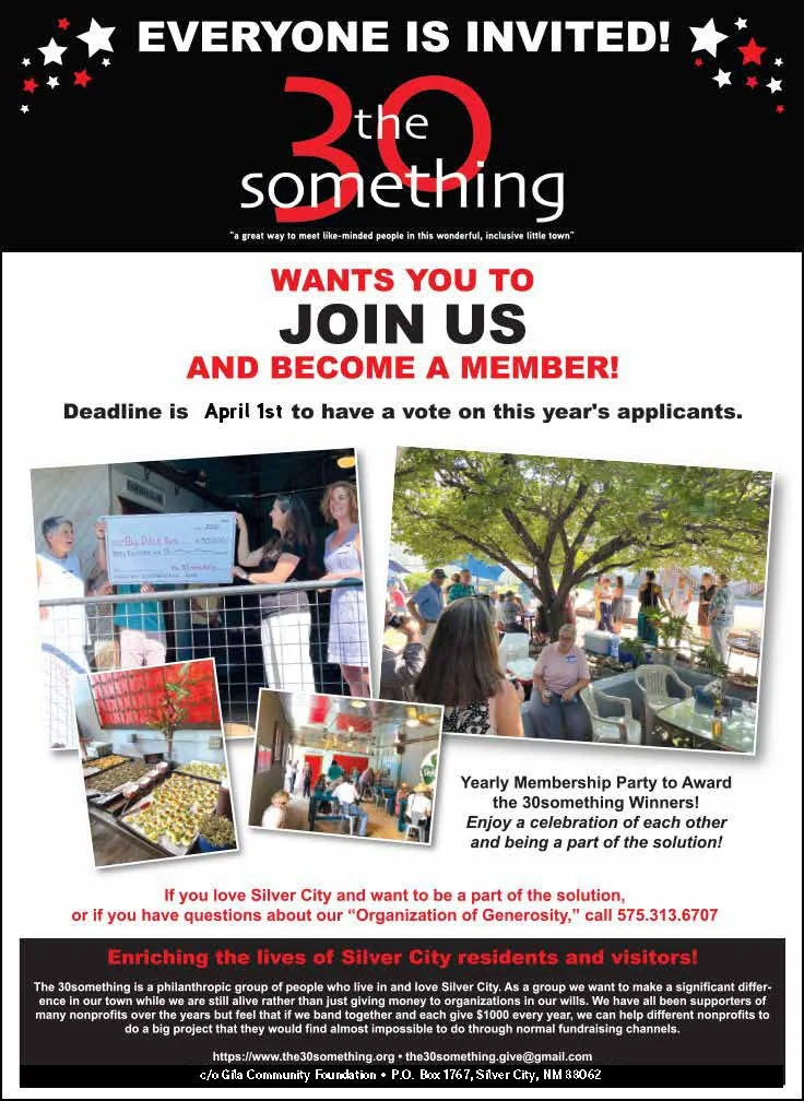 You can send your $1,000 annual donation, payable to the Gila Community Foundation (on the memo line note "the30something") to P.O. Box 1767, Silver City, NM 88062 or you can drop off your donation at the GCF physical address: 1106 N. Pope St., Silver City. If you must pay by credit card, use the donate button below.